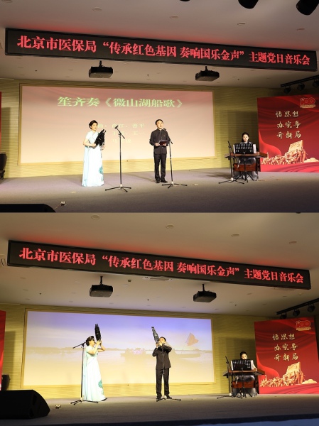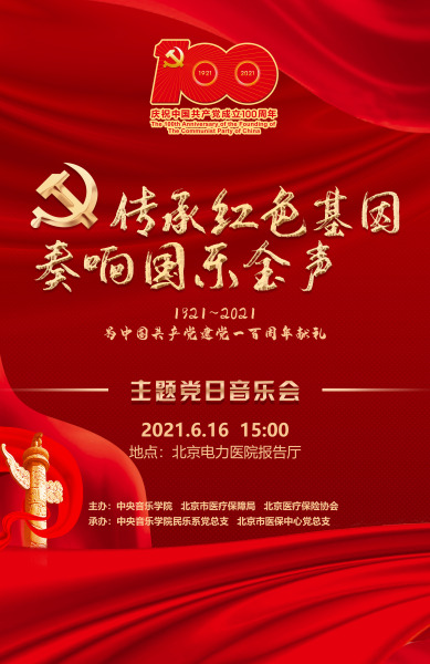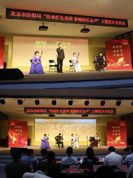 2021年6月16日下午,由中央音乐学院民乐系党总支、北京市医保中心党总支联合举办的“传承红色基因,奏响国乐金声”主题党日音乐会在北京电力医院报告厅上演。医保局党委书记马继业、中央音乐学院党委组织部部长齐雅娜、医保协会副会长蒋继元等领导嘉宾与医保局、医保协会、北京电力医院200多名党员干部现场观看,各区医保经办机构6000多名党员干部线上观看了这场饱含深情、充满新意的音乐会,广大党员干部线上线下交流互动,共同致敬伟大时代。