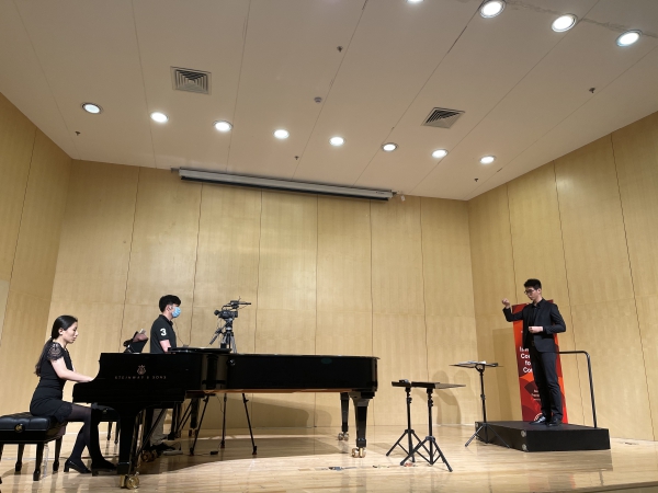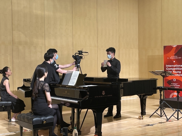 自1999年第46届法国贝桑松国际青年指挥家比赛亚洲区预选赛在北京成功举办后,中央音乐学院已经成功承办了11届亚洲区预选赛,为亚洲的年轻指挥家提供了迈向世界比赛的舞台。2021年,来自世界各地的306位选手分别在法国贝桑松、德国柏林、加拿大蒙特利尔和中国北京报名参赛。由于世界各地新冠肺炎疫情与旅行禁令,本届亚洲区预选赛采用现场录制视频的比赛形式。为了保证比赛顺利进行,国际交流处与比赛组委会多次沟通,指挥系精心布置了比赛候场室和赛场。6月24日,21位中国选手在贝桑松国际青年指挥家比赛的亚洲官方合作伙伴—中央音乐学院的钢琴系音乐厅亮相。比赛组委会总监JEANL-MICHEL MATHE先生、评委CATHERINE LARSEN-MAGUIRE女士和JACQUES MERCIER先生在视频中热情欢迎参赛选手并宣读了比赛规则。经指挥系和港澳台办公室协调,2位香港选手经过21天集中隔离及后续居家健康观察后终于得以参赛。预选赛结束后,比赛评审团将对预选赛的录音和录像进行评议,并在今年夏天选出20位晋级选手参加9月在法国贝桑松举办的半决赛与决赛。