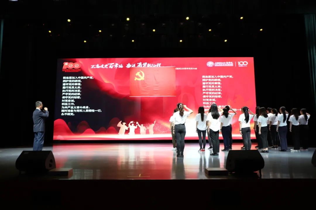 随后,退休老党员代表晁钢令带领大家重温入党誓词。晁老师为大会专门创作了一首诗歌,深情朗诵献礼党的生日。作为领誓人,他带领商学院全体师生党员面对党旗、举起右手进行庄严宣誓。“我志愿加入中国共产党......”商学院师生党员铿锵有力的宣誓声响彻整个会场,大家用对信仰最深刻的检阅和激励,庆祝党的生日和自己的政治生日。