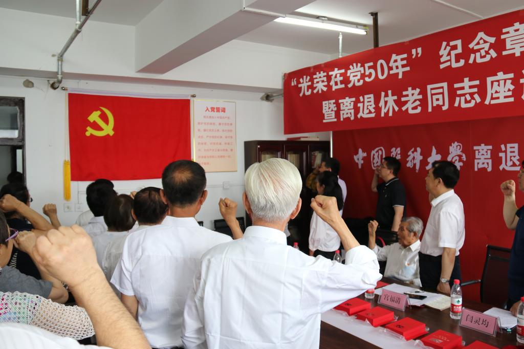 党委书记宫福清为“光荣在党50年”党员代表颁发纪念章并合影留念。