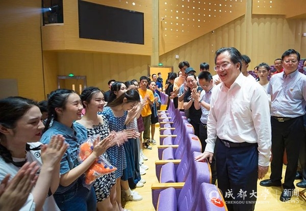 继在成都首演成功后,6月26日和27日晚,我校大型原创音乐剧《红梅花开》在新落成的自贡盐都大剧院上演,献礼中国共产党建党100周年。自贡市委书记范波率队观看了演出。