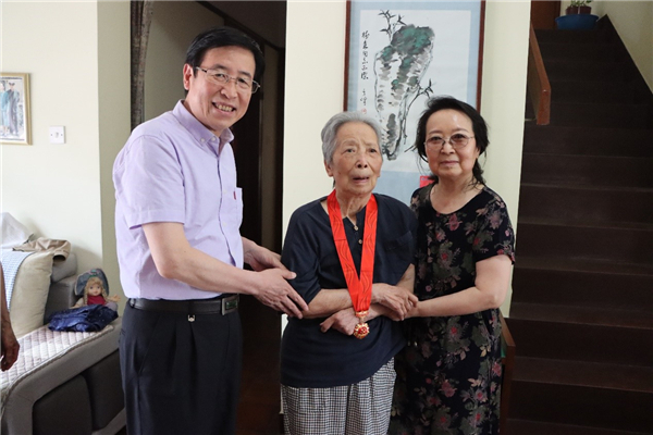 6月29日,校党委书记李家俊来到离休老党员倪征老师家中慰问,为倪征老师佩戴“光荣在党50年”纪念章,并代表学校党委送上节日的问候。倪征老师是已故老校长李曙森同志的夫人,1950年加入中国共产党。李家俊向家人详细了解倪征老师的身体状况和生活中有什么困难,表示学校将努力为老同志们做好服务,让他们安享晚年。