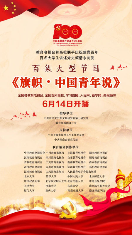 百集大型节目《旗帜·中国青年说》的推出,饱含了项目指导单位和所有参与策划制作单位对中国共产党成立100周年的喜悦之情与一片赤子之心,凝聚了所有参与人员近500余人的责任担当和辛勤付出。这是一部将百年党史与青年学子相结合的百集巨作,是全国大学生庆祝中国共产党百年华诞的一份真挚表达!