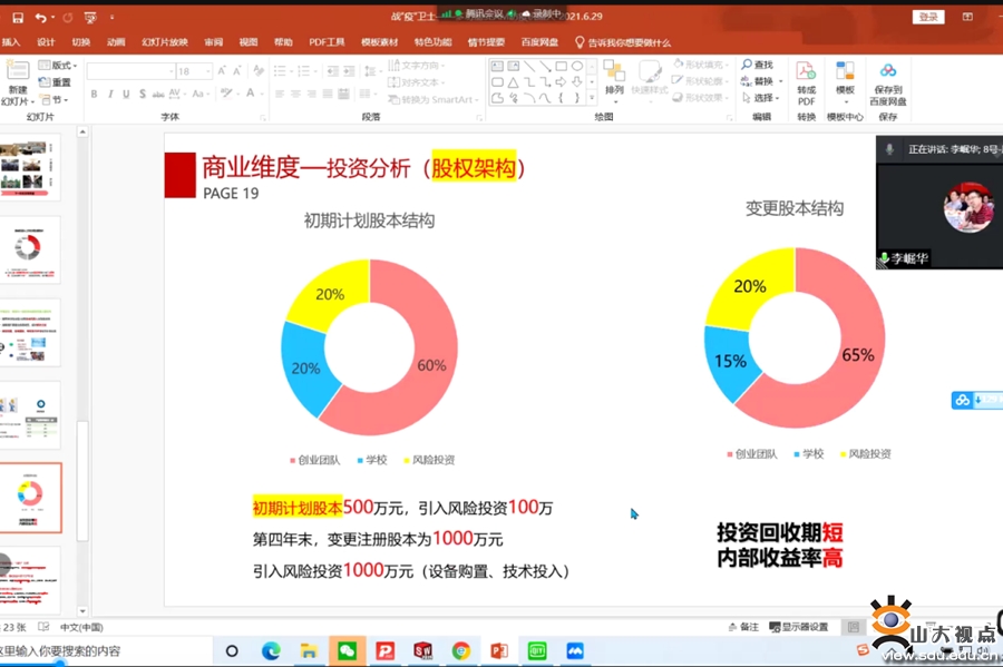 6月23日和6月24日晚,邀请上海市科技创业中心原副主任、上海科技创业有限公司原总经理韩明远线上对入围校赛决赛的38个项目进行第二轮指导,各团队严格按省赛流程进行汇报,韩明远老师逐一点评,并针对路演答辩等问题和同学们进行了交流。