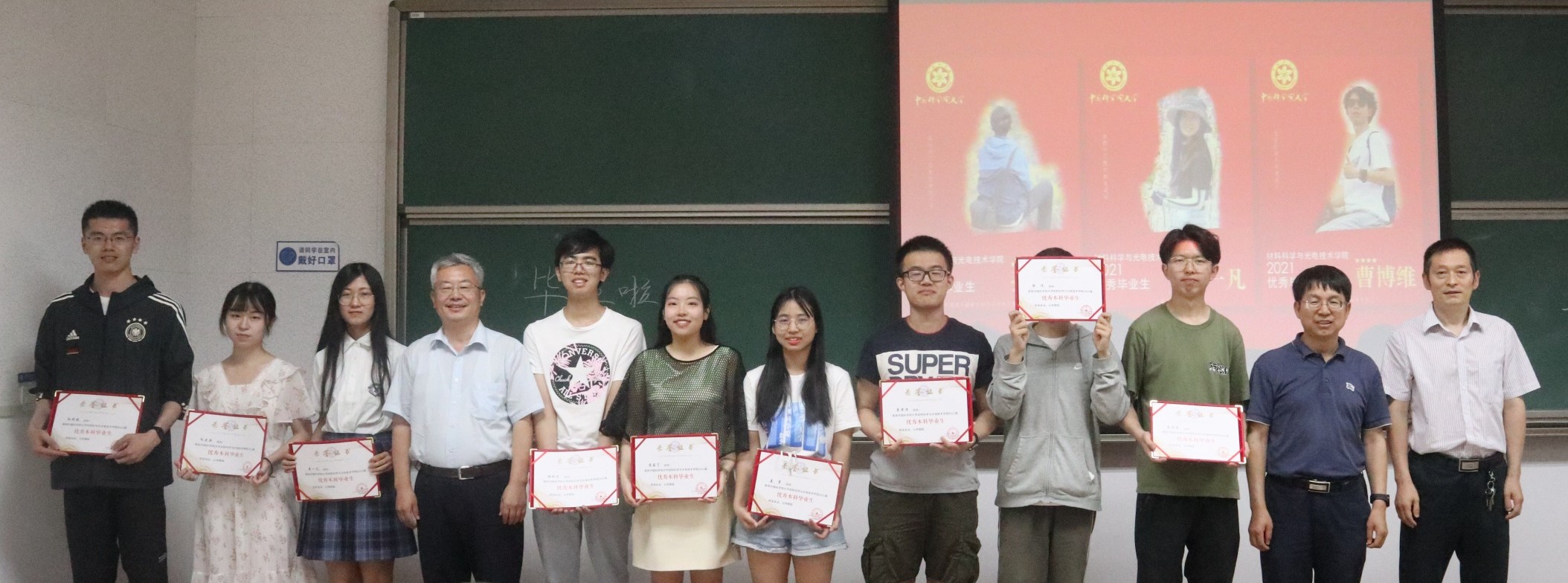 胡中波、燕敦验为2020届校级优秀毕业生王舒同学及校级优秀毕业论文获得者肖彧、王田雨、张铁怀同学颁发获奖证书并合影留念。谭平恒、陈广超、张举为2021届学院优秀毕业论文以及学院优秀毕业生获得者蒋薇宁、佟雨桐、曹博维、陈思晗、秦源浩、向姿颖、单一凡、黄纯杰、刘兆龙、谢树杰、姜翠、徐恺、孙毓健等同学表彰颁奖颁发了获奖证书。每个人脸上都洋溢着开心的笑容,这一刻,是对他们大学四年努力学习和创新能力的肯定,值得铭记。