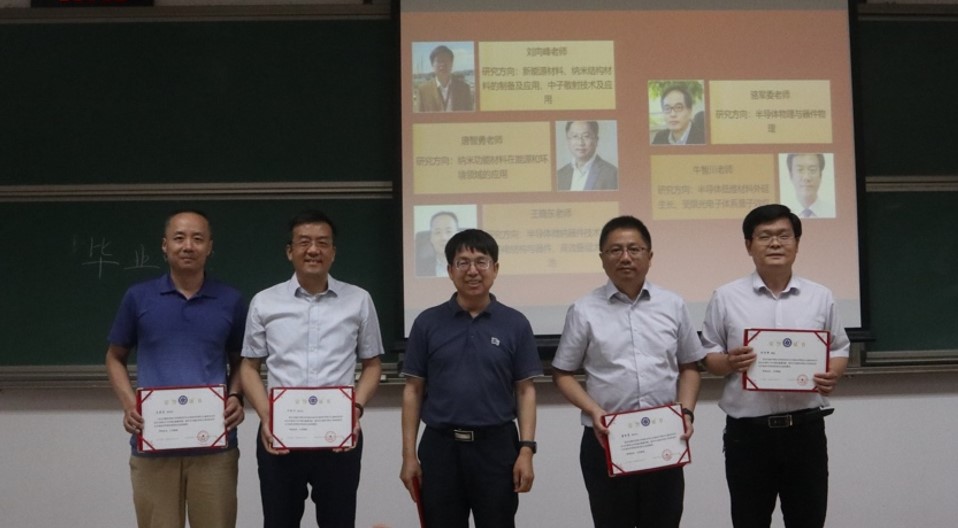 谭平恒为唐智勇、王晓东、骆军委、牛智川、刘向峰等五位学院优秀毕业论文指导教师颁奖。作为学业导师代表,国家纳米科学中心唐智勇研究员和中国科学院物理研究所的索鎏敏研究员各自分享了自己指导本科生的感受与体会。唐智勇对同学们提出了三点建议:学会沉淀、懂得合作和注重细节。索鎏敏结合自己培养四名国科大本科生的经验,称赞了国科大本科教育“小而精”的特点。两位老师的谆谆教诲和他们为本科教育的贡献赢得了在座老师和同学们的阵阵掌声。